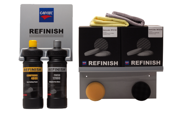 In the meantime, the products have been redesigned, but the Refinish products have also been a part of Cartec’s range for a long time. In 2010, Cartec launched these first Refinish products, the Compound 4800 and Finish 12000. Already then, the products were colour coded, meaning that there was a corresponding pad and microfibre cloth for both products. And, of course, the Refinish wall mount system to keep the workplace well-organised.