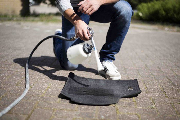 Als bekleding licht vervuild is, zou een goede stofzuigbeurt wellicht voldoende zijn. Neem het juiste opzetstuk om elk deel van de bekleding en plooien te kunnen bereiken. Zit er een lichte vervuiling op die je niet weg krijgt met stofzuigen, dan zou je ervoor kunnen kiezen om dit te reinigen met een Tornador Gun. Dit apparaat werkt op luchtdruk. In de beker van de Tornador Gun zit een klein, ronddraaiend buisje welke een tornado effect geeft. Je kunt met deze gun ook Interior Cleaner aan de luchtstroom toevoegen. Het vuil wordt met deze manier als het ware ‘losgeslagen’. Dit zorgt ervoor dat lichte vervuiling snel verwijderd wordt.